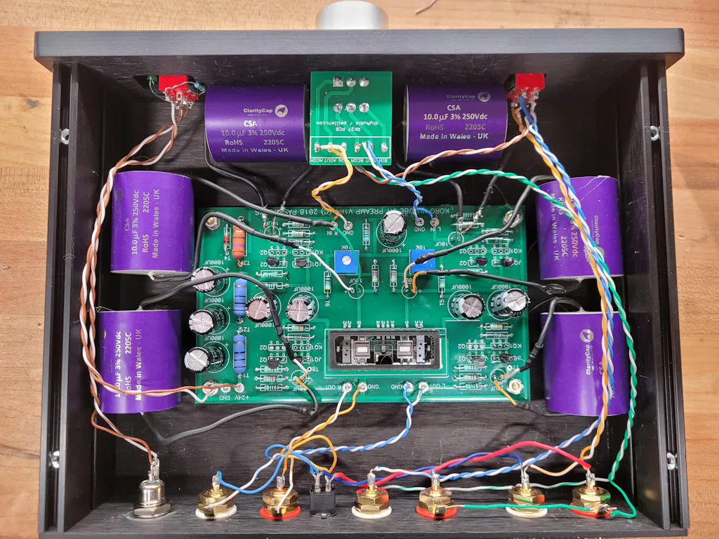 I decided to give it one last chance by replacing all six of the 10 uf capacitors in the signal path with some mid-grade ClarityCap CSA polycaps. They can be had at Madisound for $18 each plus shipping. In addition to being relatively cheap, they are physically small enough to (barely) fit into the stock chassis.