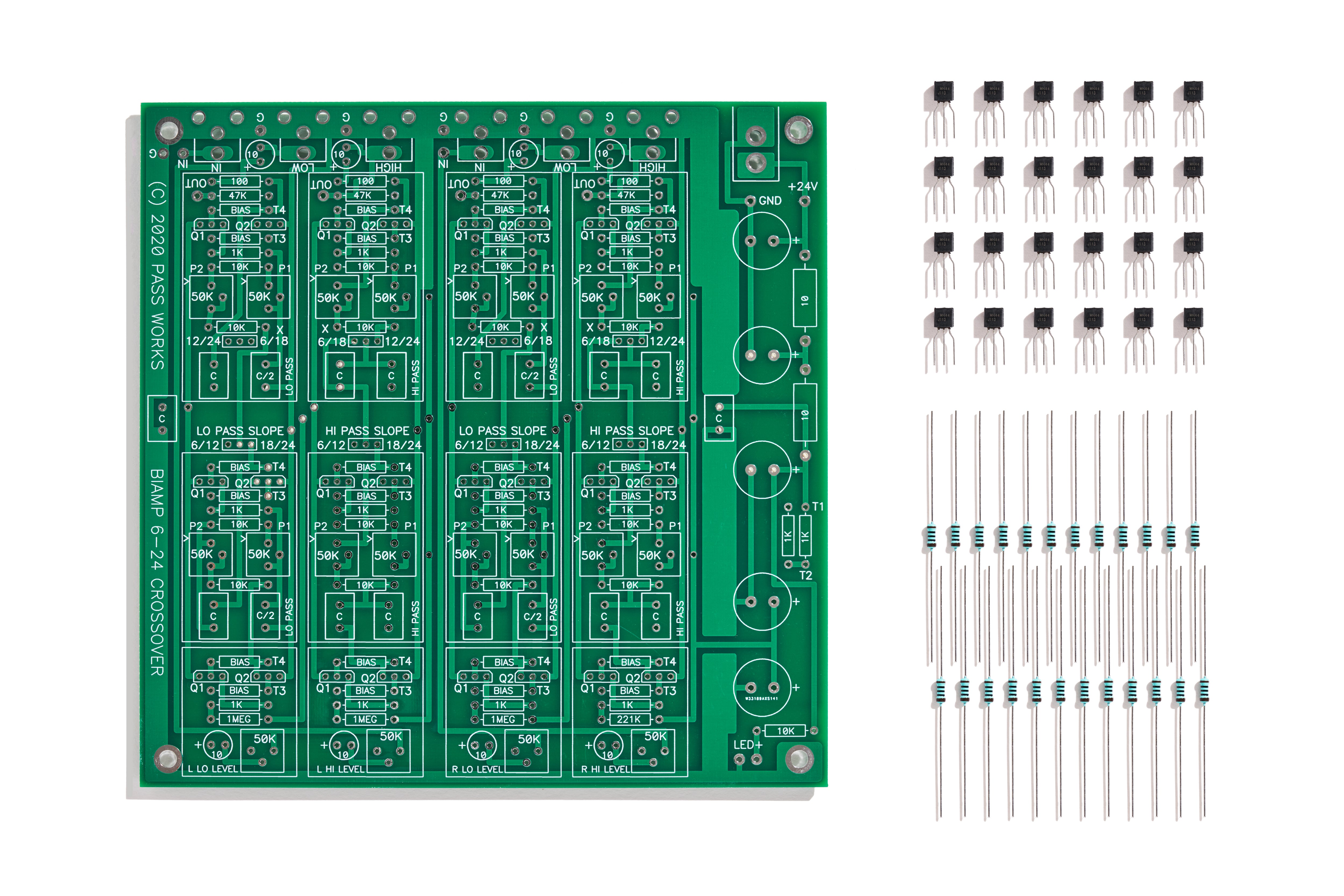 The DIY BIAMP 6-24 kit is a stereo analog active bi-amp crossover circuit designed for high flexibility. Featuring 12 discrete JFET buffer circuits operated without negative feedback, it offers 16 continuously adjustable filter elements in two low-pass and two high-pass filters with slopes of 6, 12, 18, or 24 dB per octave and various “Q” characteristics. It has flexibility not generally offered by crossover products have “textbook” characteristics, allowing more detailed tailoring of filters around the actual character of different loudspeaker drivers.