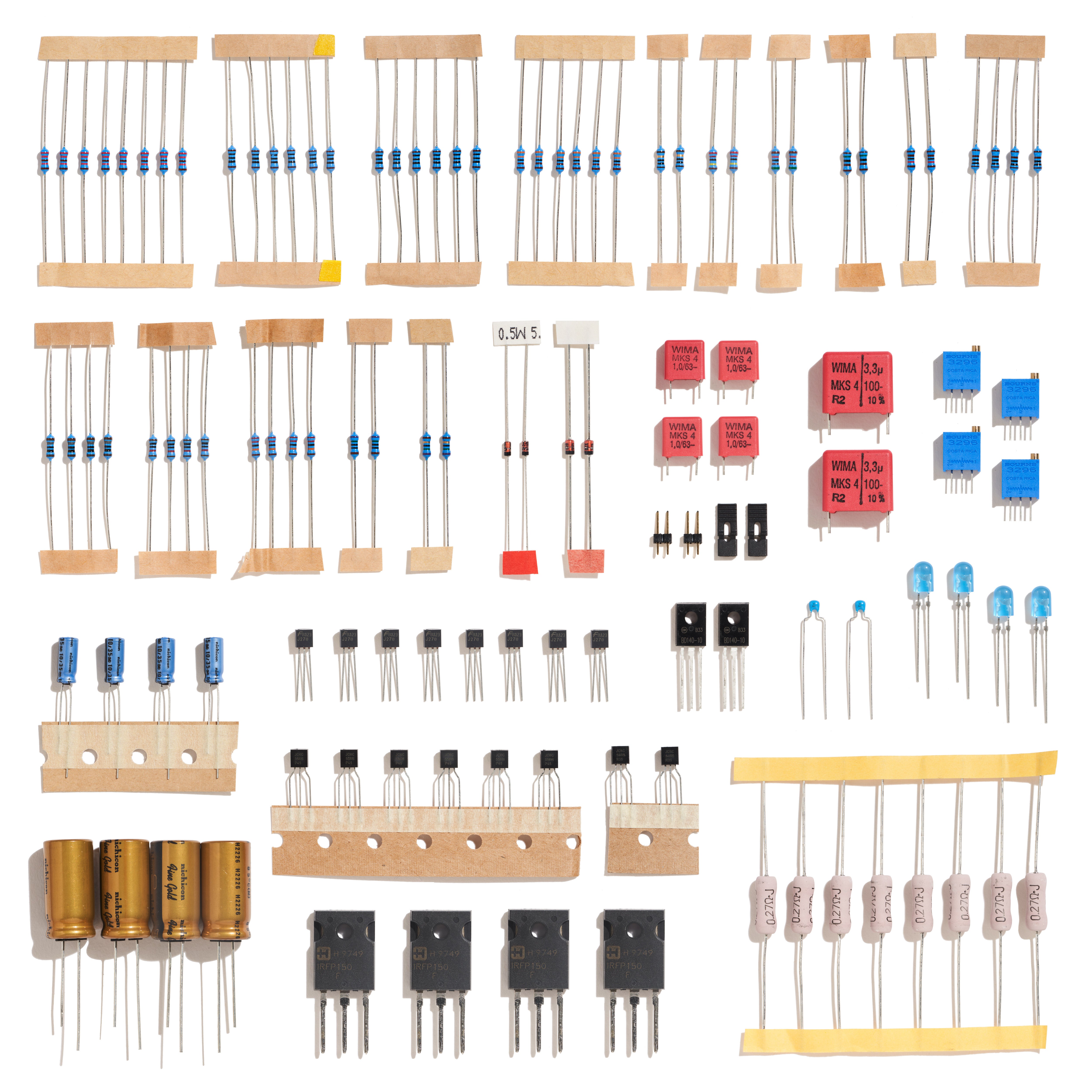 All the components you’ll need to complete a pair of amplifier boards for a stereo amplifier: