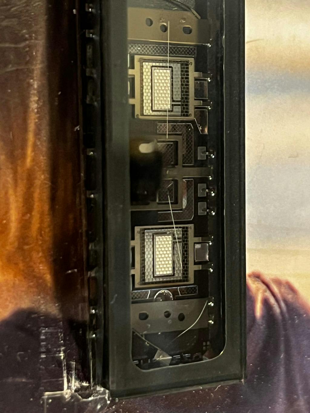Two triodes are packaged together into one glass package, which is again borrowed from VFD manufacturing. It looks a bit like an old 40-pin DIP IC package, but has pins only along one edge. See Photo 2.