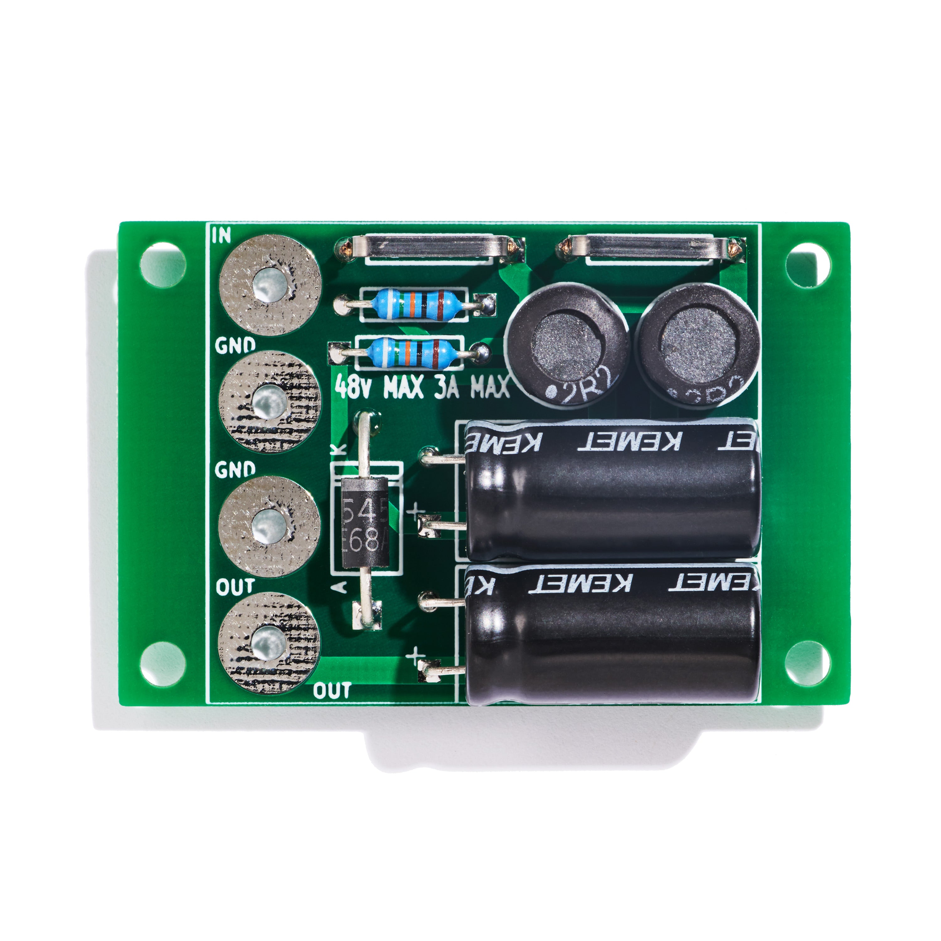 This filter is limited to single rail 48V DC, 3A applications. The kit contains top-quality parts as selected by the circuit’s designer which includes KEMET ESH477M050AH4AA or Nichicon UHW1H471MPD capacitors and top-quality Bournes inductors RLB0912-2R2ML. The kit’s PCBs are fabricated using 2oz copper and tinned thru-holes for low noise operation and ease of assembly.